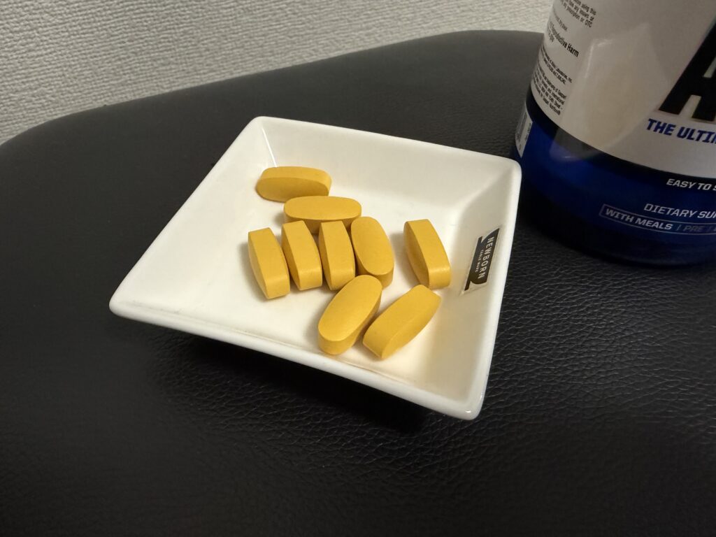 食後に1日3粒を目安として、朝に3粒を摂取してます。脂溶性ビタミン(A・D・E・K)は食事と一緒に摂ると吸収率が上がるため、食後のタイミング推奨ですが、自分は朝食代わりにプロテインと一緒に飲んでいます。空腹時に飲むと胃がムカつくこともあるので、必ず食後に摂取しましょう。
