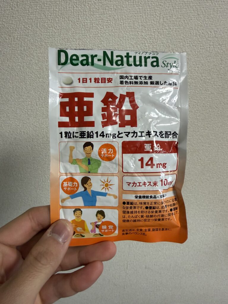 飲み方は就寝前に1粒。亜鉛は就寝中の成長ホルモン分泌をサポートするという観点から、夜に摂るのが一般的とされています。特に大きな問題点もなく、1粒飲むだけで完結するので続けやすいです。