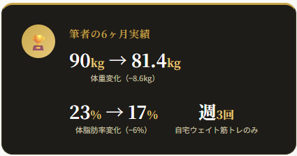 6ヶ月間、自宅筋トレ週3回だけで体脂肪率を8%落としました。その間ずっと手放さなかったのがこの4種のサプリ。完璧な食事管理や毎日のジム通いをしなくても、サプリで不足を補いながら継続できる環境を作ることが「30代の現実的な戦略」だと思います。