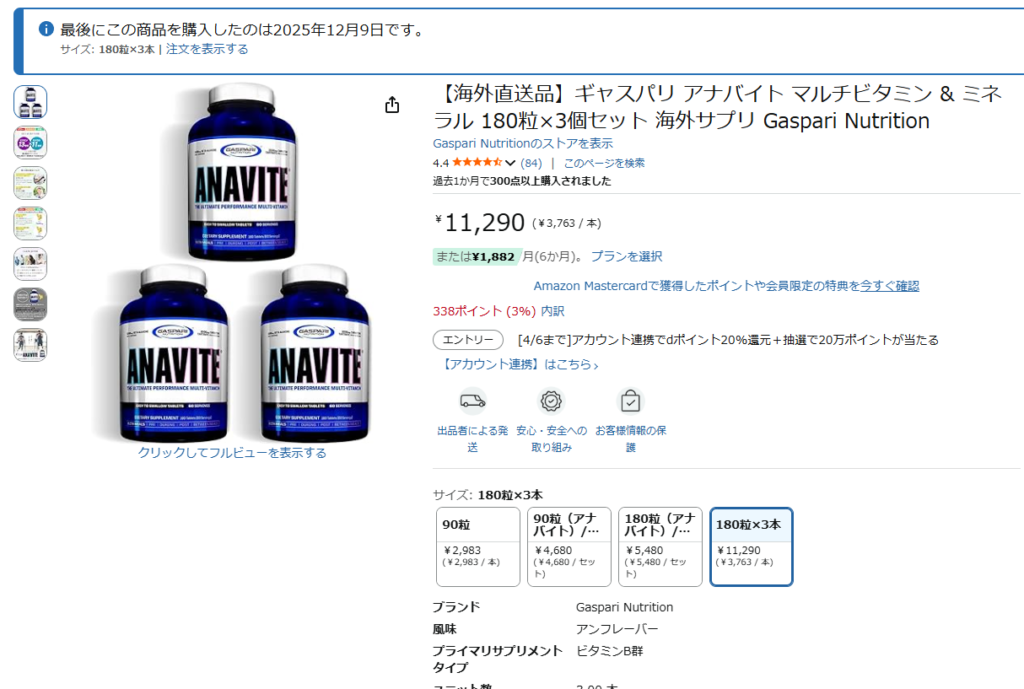 減量中は食事量が減ります。食事量が減るということは、ビタミン・ミネラルの摂取量も自然と落ちるということ。30代になると疲労回復のスピードが明らかに20代と違うと感じる人も多いでしょう。栄養素の不足はそれをさらに悪化させます。アナバイトを選んだのは、アスリート向けに設計されたビタミン・ミネラルの配合が充実しているからです。