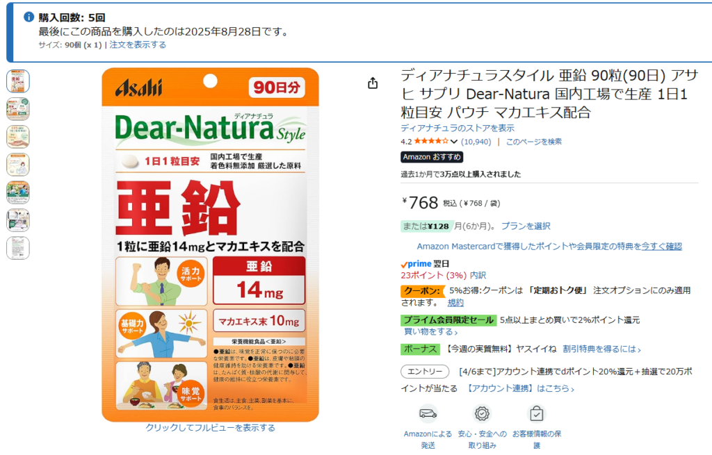今なら、Amazonで5%クーポンがあるため、さらに安く購入できます。効果を実感できてるかは確証はありませんが、安価に試せるので損はしにくいハズです。